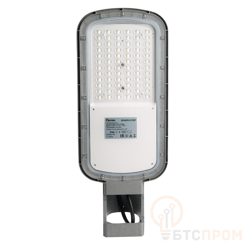Уличный светильник консольный светодиодный, на столб (ДКУ) FERON SP3070, 50W, 5000К (дневной), 90-300V/50Гц, 8000Lm, IP66, угол рассеивания 120°, 72LED*SMD3030, класс защиты 1, раб.t -55°..+50°С, цвет серый, корпус алюминий, 433*170*75мм,