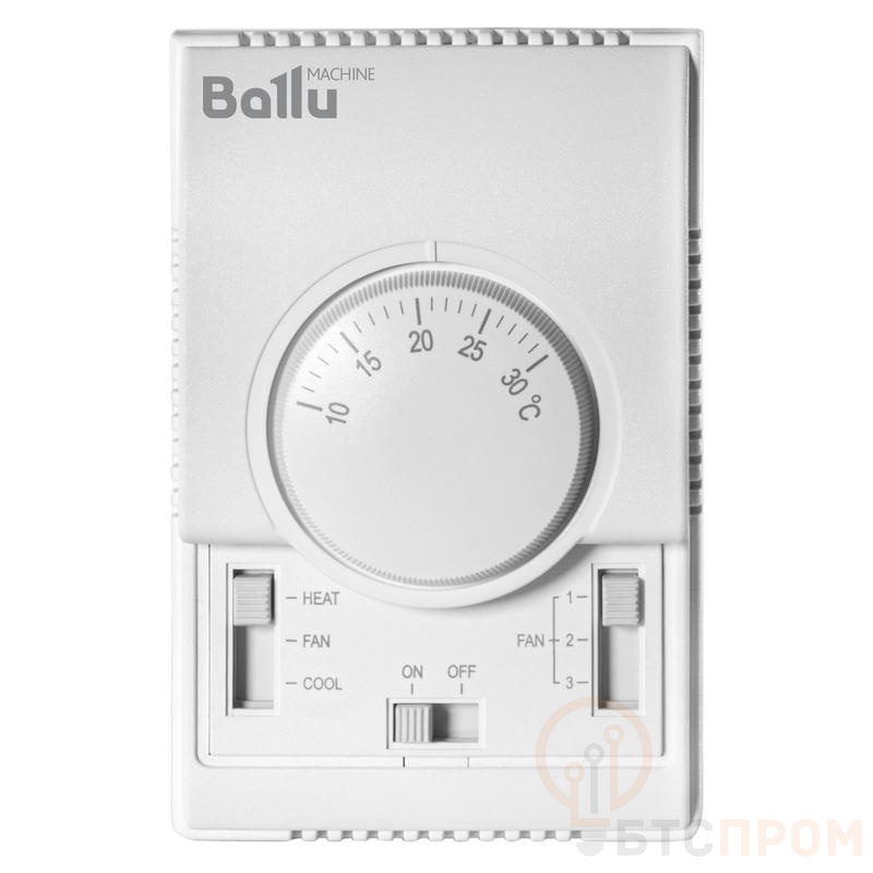 "Механический термостат для автоматического поддержания температуры помещения и регулирования расхода воздуха на водяных тепловентиляторах BALLU MACHINE серии W2, W3, W4 и BDS. Термостат оснащен встроенным температурным датчиком, который измеряет температуру внутри помещения, и при достижении заданного значения подает команду на выключение вентилятора и перекрытие потока теплоносителя через теплообменник Преимущества: - Увеличенный ток коммутации до 8 Ампер. Допускается подключение нескольких тепловентиляторов к одному пульту - Два режима поддержания температуры, только перекрытием клапана (для помещений большого объема) либо отключением вентилятора и перекрытием клапана (для небольших помещений) - Совместная работа с электромагнитными клапанами SF 20-2 и VB20-2 - Режим работы на охлаждение (подходит для фанкойлов) - Накладной монтаж, не требует штробления стен"