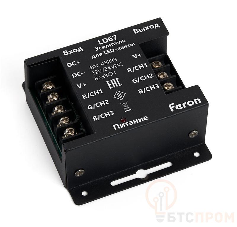 Усилитель для светодиодной ленты RGB 24А12-24В LD67 от FERON (арт. 48223) — это компактное и мощное устройство, предназначенное для стабильной работы больших систем подсветки. Модель принимает слабый сигнал от RGB-контроллера и усиливает его, обеспечивая равномерное и яркое свечение светодиодных лент на значительном расстоянии без потери качества цвета.