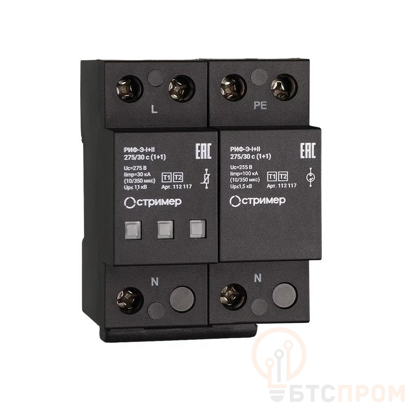Устройство защиты от импульсных перенапряжений РИФ-Э-I+II 275/30 с (1+1) Стример 112117 предназначено для комплексной защиты однофазных сетей 220/380В. Оно обеспечивает защиту от импульсных перенапряжений, вызванных ударами молнии и коммутационными помехами, совмещая в одном модуле защиту 1-го (B) и 2-го (C) классов.