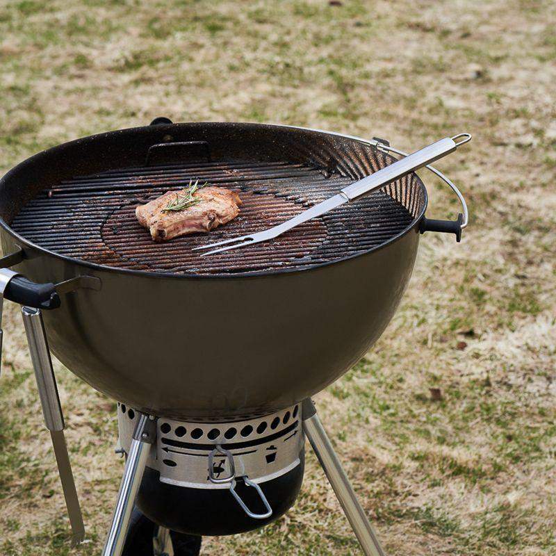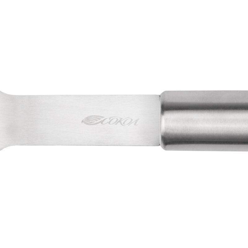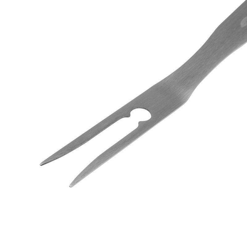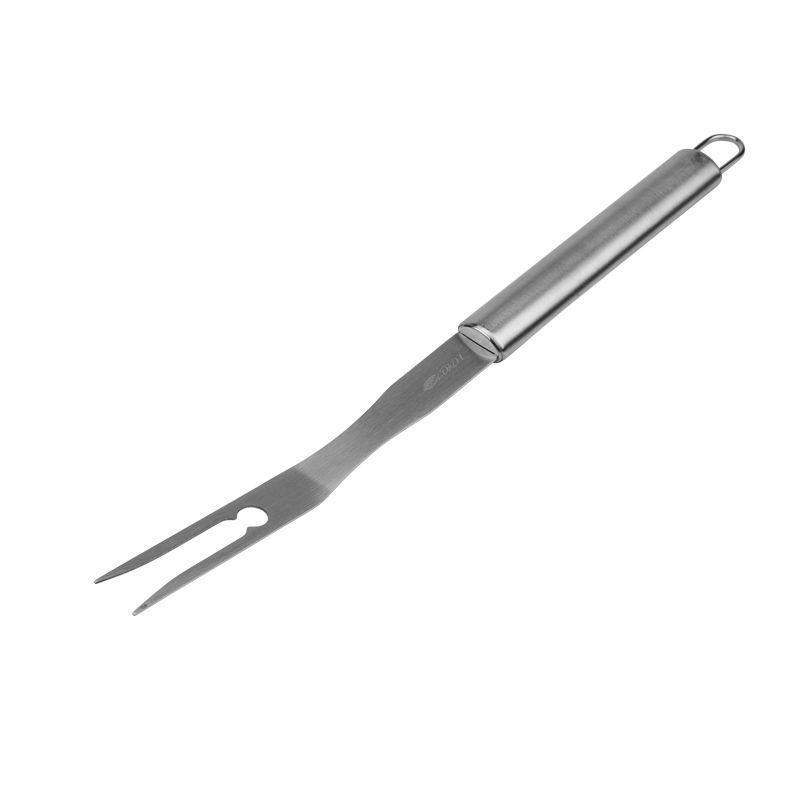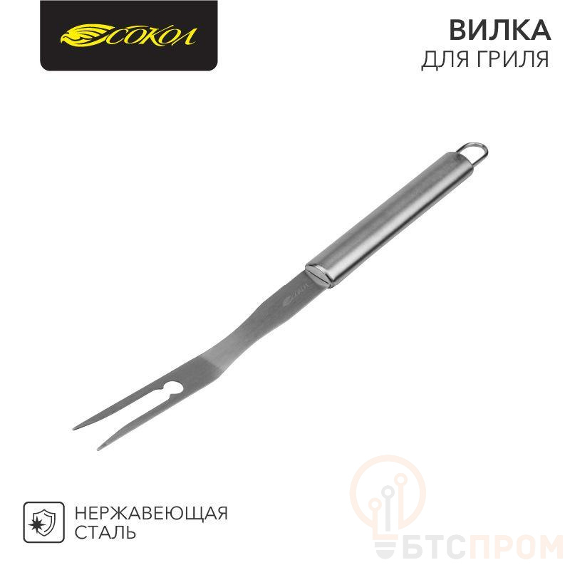 Вилка для гриля СОКОЛ изготовлена из прочной нержавеющей стали, не подвергающейся коррозии и изменениям рабочих свойств. Столовый прибор можно мыть в посудомоечной машине. Термостойкий металл в составе рукоятки отвечает за безопасность применения и уберегает от случайных ожогов и травм. Вилка с 2 заостренными зубцами служит для удержания продукта. Не повреждает кусок, а бережно захватывает для дальнейшей сервировки. Вилка может использоваться совместно с ножом для одновременного удержания продуктов (мяса, рыбы, овощей) и их нарезки.Размер изделия: 435х30х20 мм.