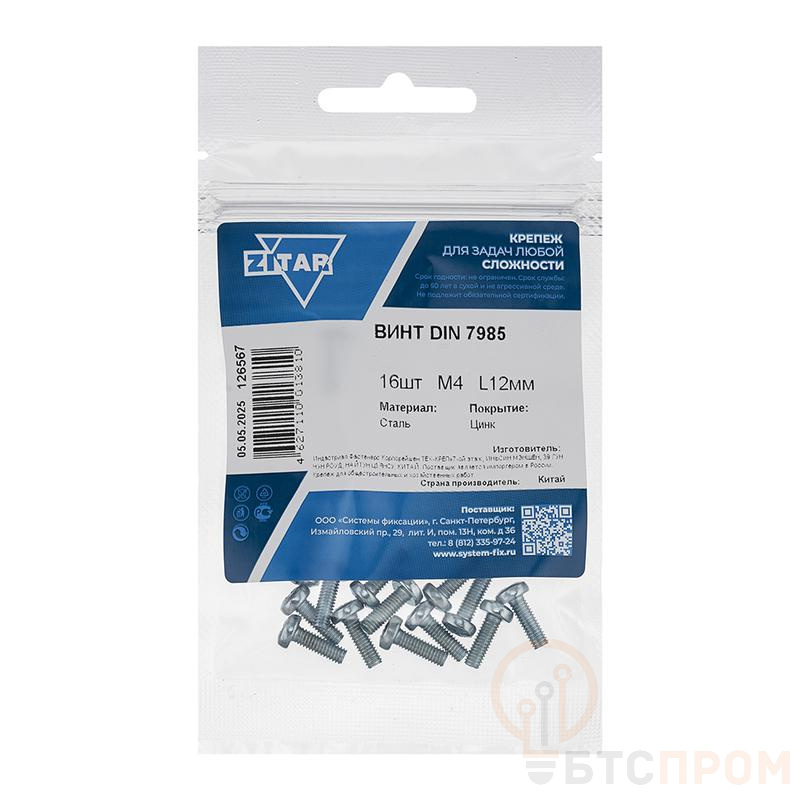 Винт с полукруглой головкой М4х12 DIN 7985 оцинк. (уп.16шт) Tech-Krep/Zitar 126567 фото в каталоге от BTSprom.by