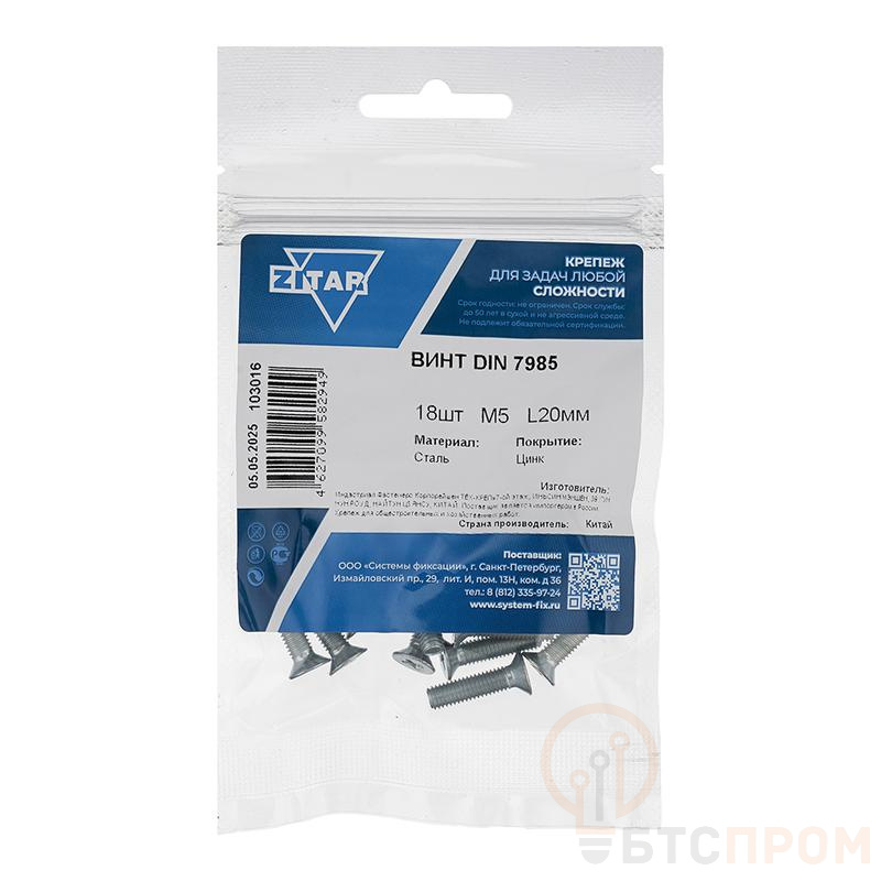 Винт с полукруглой головкой М5х20 DIN 7985 оцинк. (уп.18шт) Tech-Krep/Zitar 103016 фото в каталоге от BTSprom.by