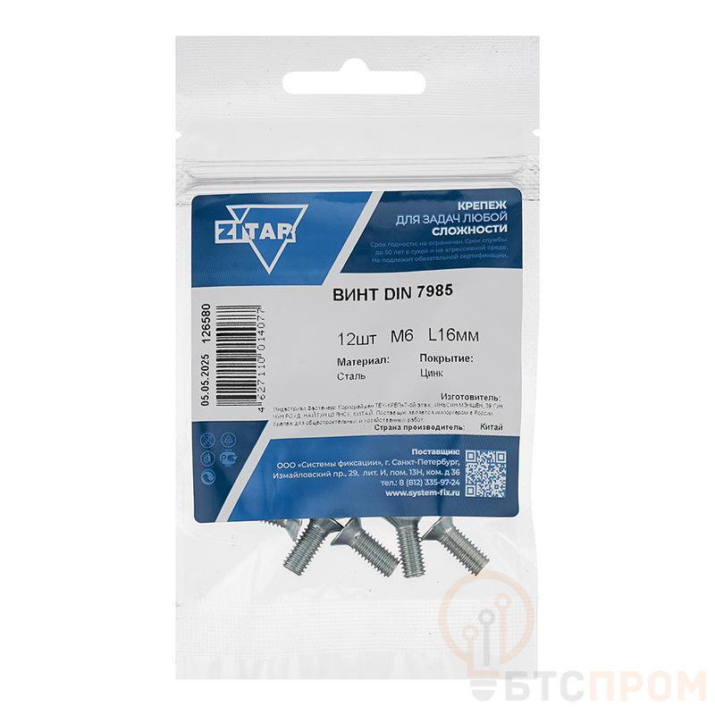 Винт с полукруглой головкой М6х16 DIN 7985 оцинк. (уп.12шт) Tech-Krep/Zitar 126580 фото в каталоге от BTSprom.by