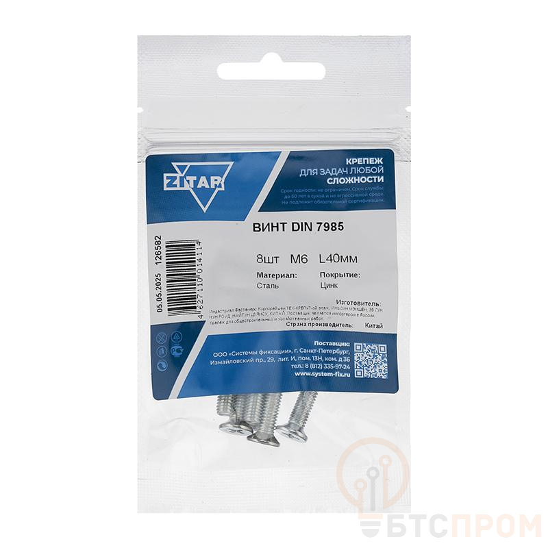 Винт с полукруглой головкой М6х40 DIN 7985 оцинк. (уп.8шт) Tech-Krep/Zitar 126582 фото в каталоге от BTSprom.by