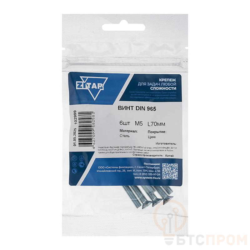 Винт с потайной головкой М5х70 DIN 965 оцинк. (уп.6шт) Tech-Krep/Zitar 102999 фото в каталоге от BTSprom.by