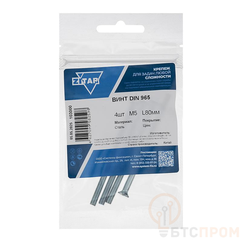 Винт с потайной головкой М5х80 DIN 965 оцинк. (уп.4шт) Tech-Krep/Zitar 103000 фото в каталоге от BTSprom.by
