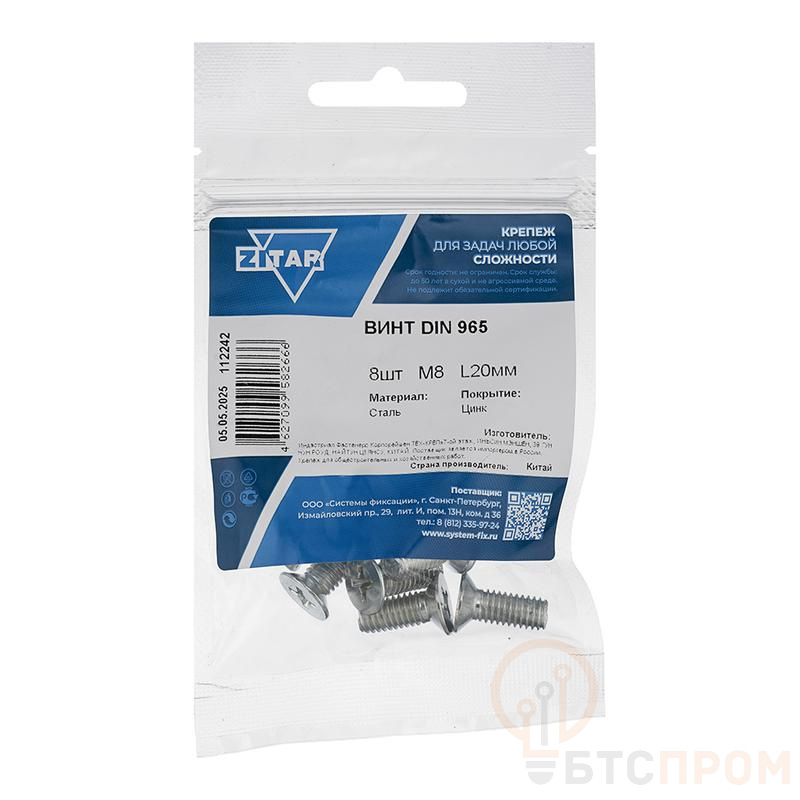Винт с потайной головкой М8х20 DIN 965 оцинк. (уп.8шт) Tech-Krep/Zitar 112242 фото в каталоге от BTSprom.by