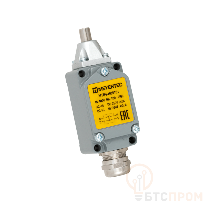 Выключатель концевой MTB4-HD5101 от ОВЕН — надежный и долговечный датчик положения, предназначенный для жестких условий эксплуатации. Корпус устройства имеет степень защиты IP66, что обеспечивает полную защиту от пыли и мощных струй воды, позволяя использовать его на улице и в запыленных цехах.