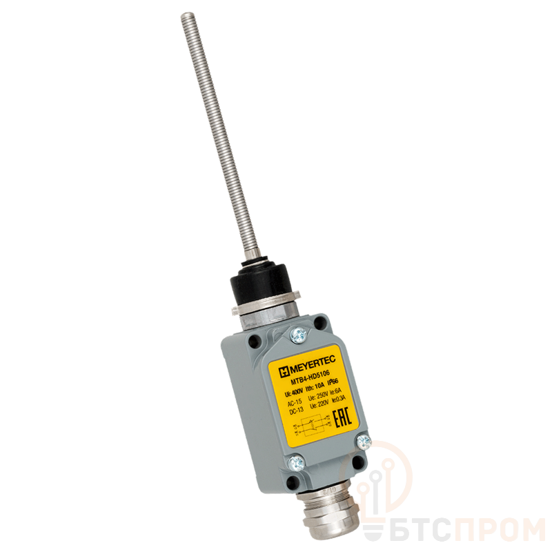 Выключатель концевой MTB4-HD5106 от компании ОВЕН — это надежный пружинный стержневой датчик, предназначенный для точного контроля положения и ограничения хода механизмов в промышленных условиях. Корпус устройства имеет высокую степень защиты IP66, что обеспечивает полную защиту от пыли и мощных струй воды, позволяя использовать его в цехах, на наружных установках и в других сложных средах.