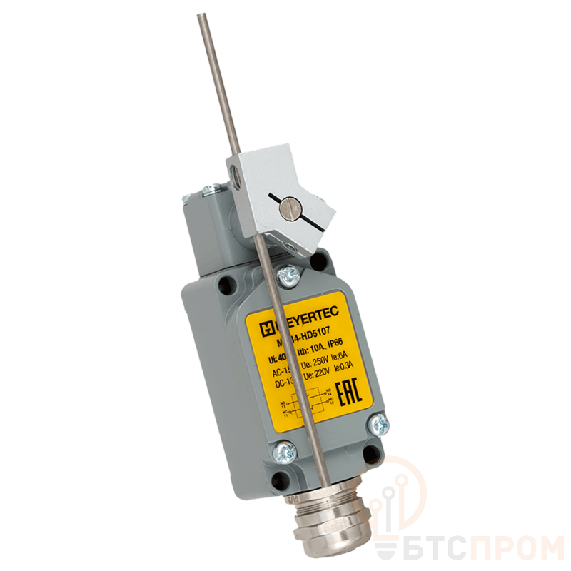 Выключатель концевой MTB4-HD5107 от ОВЕН — это надежный и долговечный датчик положения, предназначенный для работы в сложных промышленных условиях. Его ключевая особенность — поворотный регулируемый стальной шток, который позволяет точно настраивать угол срабатывания и обеспечивает высокую механическую прочность. Корпус устройства имеет степень защиты IP66, что гарантирует полную защиту от пыли и мощных струй воды, позволяя использовать выключатель на улице и в запыленных цехах.