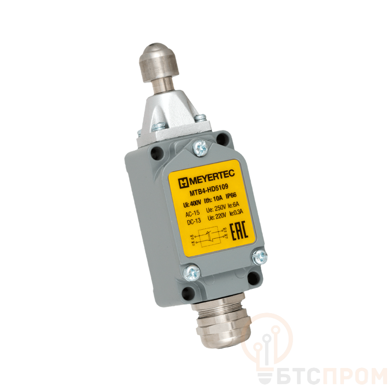 Выключатель концевой MTB4-HD5109 от ОВЕН — это надежный и долговечный датчик положения, предназначенный для работы в тяжелых промышленных условиях. Модель оснащена стальным плунжером нажимного типа с подшипником, что обеспечивает высокую износостойкость и точное срабатывание при контакте с управляемым объектом.