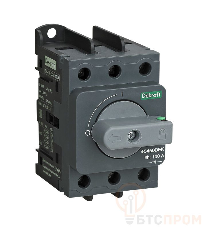 Выключатель-разъединитель Dekraft серии ВР-100С, типа ВР-101С; 3P; номинальный ток 100 А; типоразмер 100А; ном.напряжение до 690 В, 50/60 Гц. Компактный размер и монтаж на DIN-рейку. Подвод питания возможен как сверху, так и снизу аппарата.
