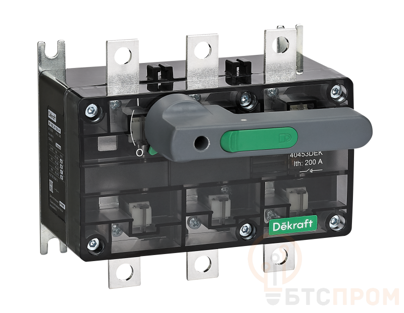 Выключатель-разъединитель Dekraft серии ВР-100С, типа ВР-103С; 3P; номинальный ток 200 А; типоразмер 200А; ном.напряжение до 690 В, 50/60 Гц. Прозрачный корпус для обеспечения видимомго разрыва. Подвод питания возможен как сверху, так и снизу аппарата.