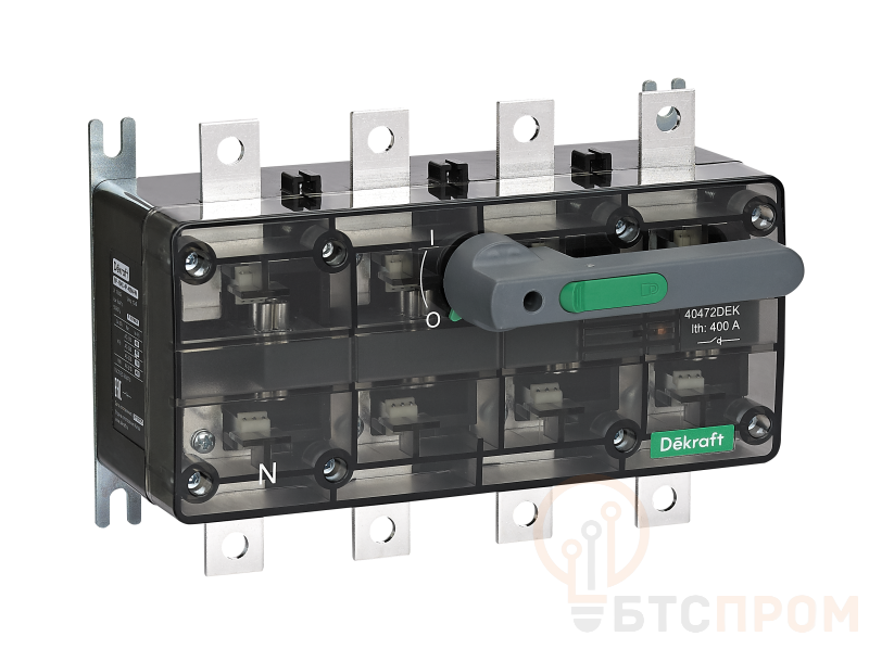 Выключатель-разъединитель Dekraft серии ВР-100С, типа ВР-104С; 4P; номинальный ток 250 А; типоразмер 400А; ном.напряжение до 690 В, 50/60 Гц. Прозрачный корпус для обеспечения видимомго разрыва. Подвод питания возможен как сверху, так и снизу аппарата.