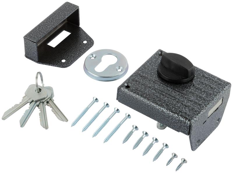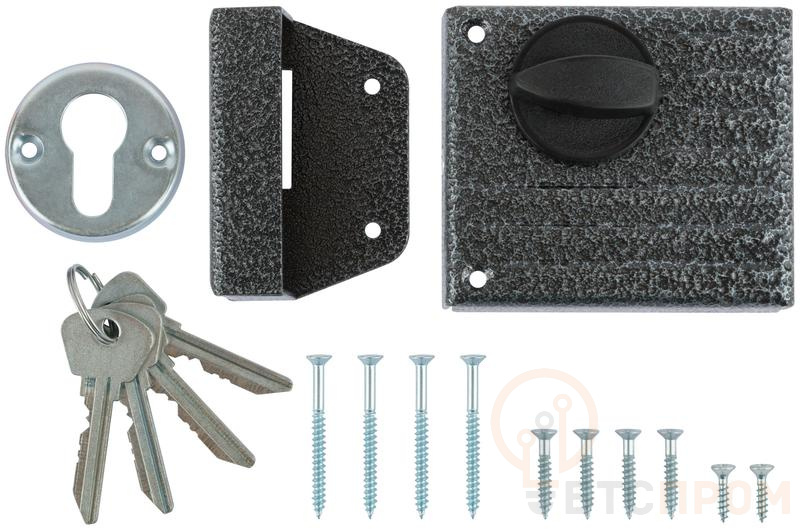 Накладной, дисковый. Для левых и правых дверей, 35-45 мм. Прямоугольный засов. Блокировка механизма ключом с внутренней стороны.