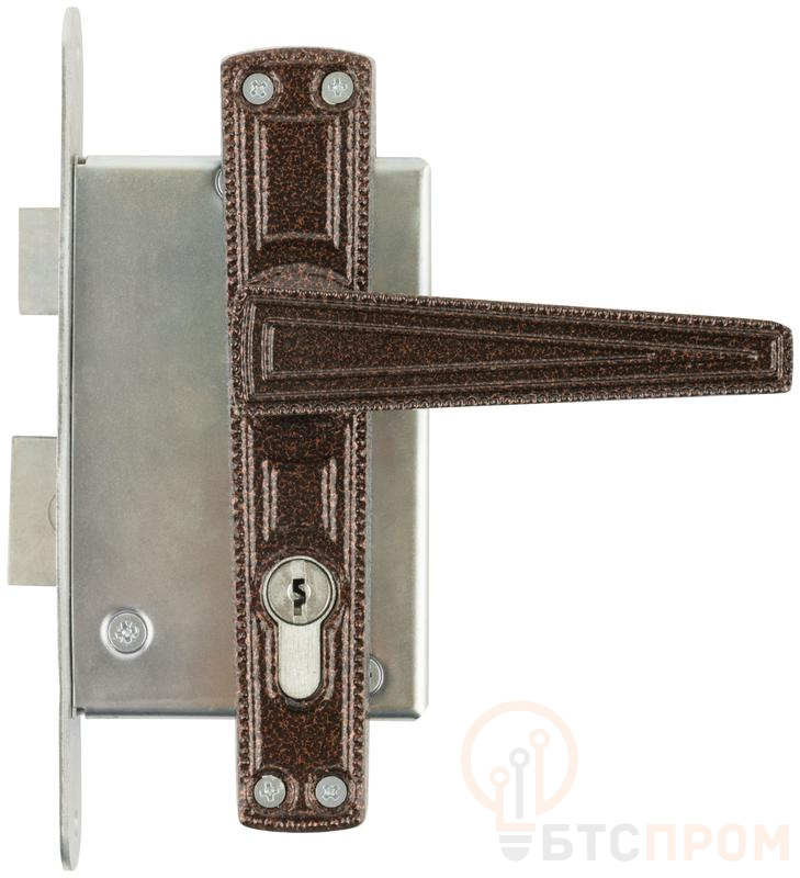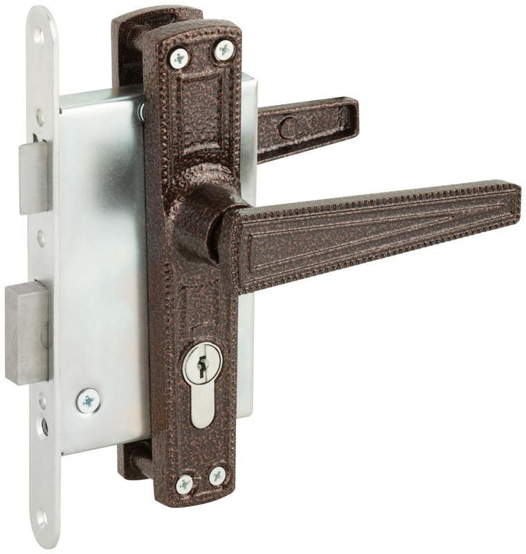 Цилиндровый, межцентровое расстояние 85 мм. Левые и правые двери 40-50 мм. Фалевые ручки с полимерным покрытием. 3-х стержневой засов.