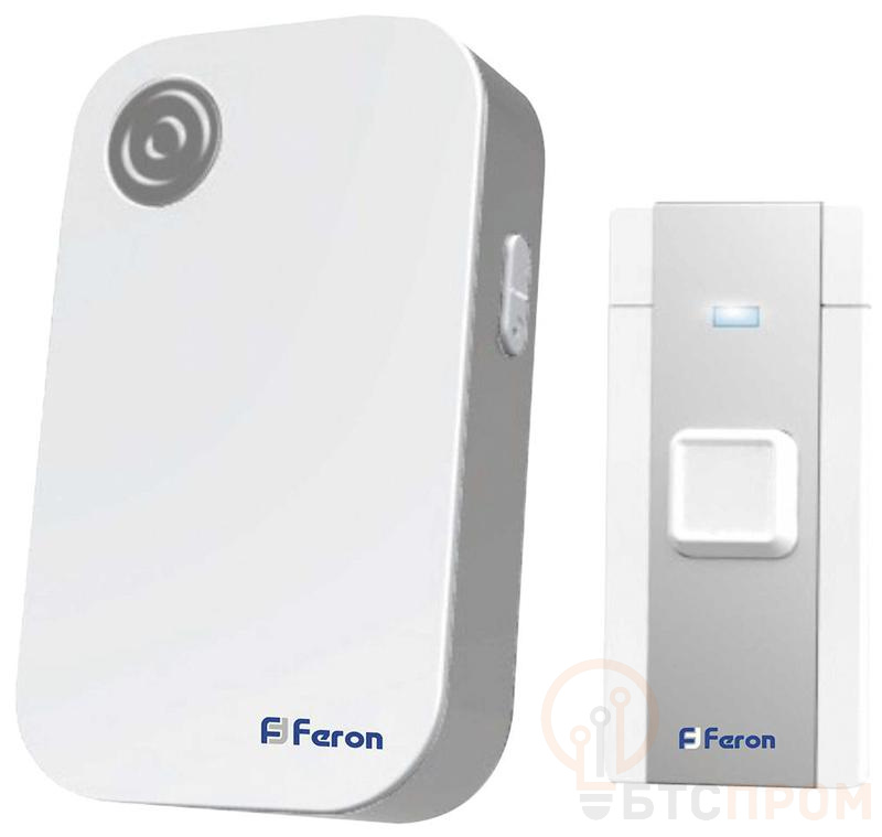 Звонок дверной беспроводной FERON E-372, 36 мелодий, дальность действия 80м, цвет белый/серый, регулировка громкости - есть, шифрование сигнала - нет; БАЗА: 3*1,5V/AAA, 27*60*100 мм, КНОПКА: IP20, 12V 23A*1 (в комплекте) , раб.t -10...+40 °С, размер кнопки 35*80*20мм