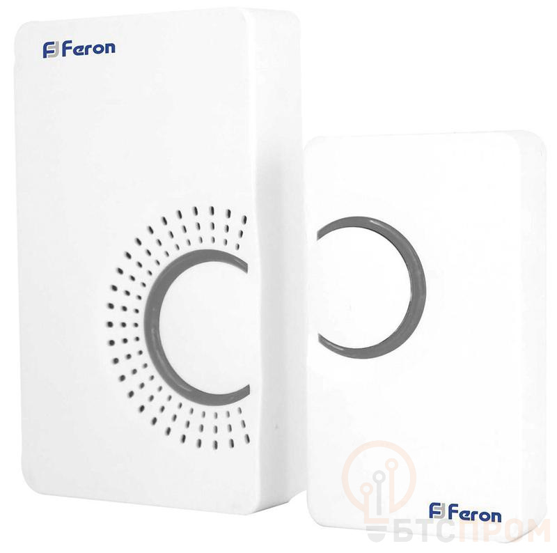 Звонок электрический дверной беспроводной FERON E-373, 36 мелодий, дальность действия 80м, цвет белый/серый, регулировка громкости - есть, шифрование сигнала - нет; БАЗА: 2*1,5V/AAA, 21*61*105 мм, КНОПКА: IP20, 12V 23A*1 (в комплекте) , раб.t -20..+70°С , размер кнопки 45*78*15мм