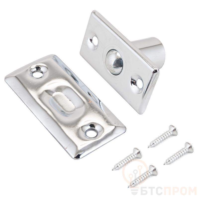 Фиксатор дверной с шариком. Предназначен для запирания межкомнатных дверей (алюминиевых, деревянных, из МДФ и ПВХ). Защелка не запирает, а защелкивает полотно, тем самым удерживая его в дверном проеме. Материал - ЦАМ, гальваническое покрытие. Габариты торцевой планки - 47х25 мм. В комплекте шурупы и ответная планка.