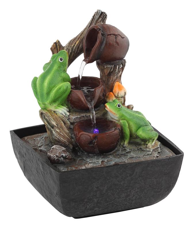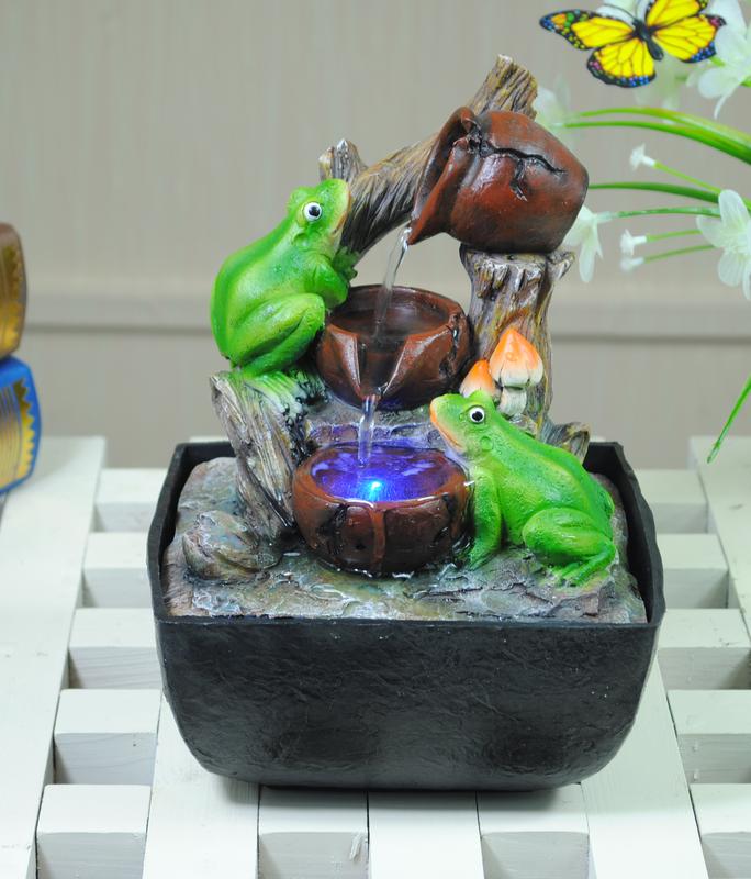 Если в собственном доме или квартире вы желаете обустроить уютный уголок, где так приятно отдохнуть после тяжелых трудовых часов, обратите внимание на настольный фонтан. Созерцание потока воды с нежным журчанием производит ощутимый релаксационный эффект, успокаивая и расслабляя. Этот небольшой фонтан высотой 24 см украшен жизнерадостными лягушками, отлично детализирован, его хочется рассматривать. Такой симпатичный декор будет радовать взгляд и поднимать настроение. Оснащен светодиодной подсветкой. Фонтан функционирует от сети.