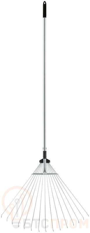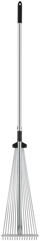 Грабли веерные регулируемые, телескопические. Для уборки листьев и скошенной травы. 15 раздвижных зубьев (180 - 630 мм). Телескопическая ручка. Материал: инструментальная сталь, закаленные зубья, пластиковая накладка на черенок.