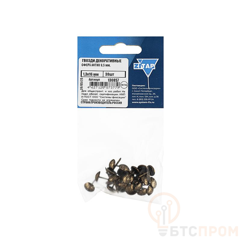 Декоративный гвоздь Сфера от бренда Zitar — это изысканный элемент для отделки и крепления, который сочетает в себе функциональность и эстетику. Изделие имеет классическую форму с элегантной полусферической шляпкой диаметром 9.5 мм. Стержень гвоздя размером 1.3х16 мм обеспечивает надежную фиксацию.