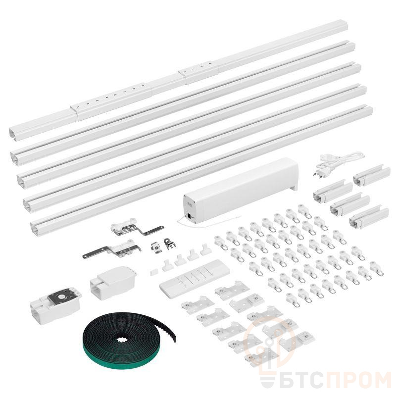 Комплект электрокарниза длиной до 5м (регулируется наборными частями) для раздвижных штор, состоящий из мотора, наборного алюминиевого трека, пульта и комплектующих. Электропривод с питанием 100-240В, мощность 45Вт, момент 1.2Нм. Управление с помощью пульта из комплекта, по WI-FI, 2.4ГГц, Bluetooth, "сухими" контактами на входе RJ45. Совместим с платформой TUYA, АЛИСА от ЯНДЕКС. Управление со смартфона через приложение SmartLife, с помощью пульта в комплекте. Ремень из комплекта находится на дне коробки. 1 мотор, 1 пульт дистанционного управления, алюминиевый профиль 1,6 мм (1м - 4шт, 0.5м - 1шт, 0.2м - 2шт., 0.1м - 1 шт.), 4 соединителя 10 см, 1 соединитель 20 см, 1 переходник 5 см, 2 шкива, 2 пряжки ремня, 2 направляющих бегунка, ремень 10,4 м, 24 бегунка, 2 фиксатора, 10 кронштейнов, 1 зажим на ремень