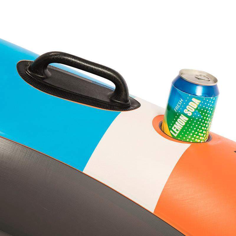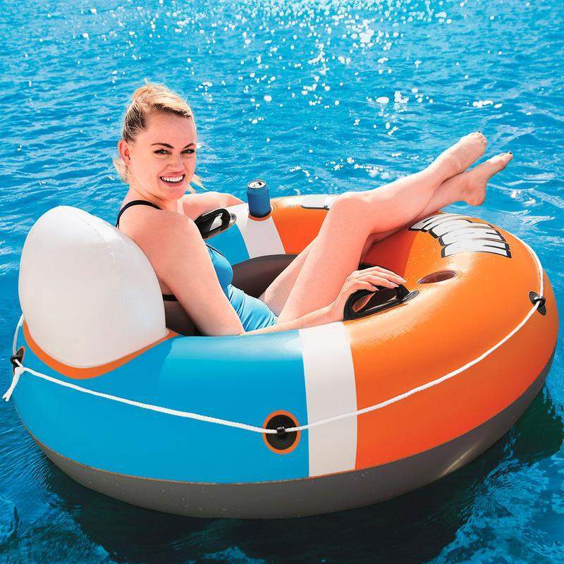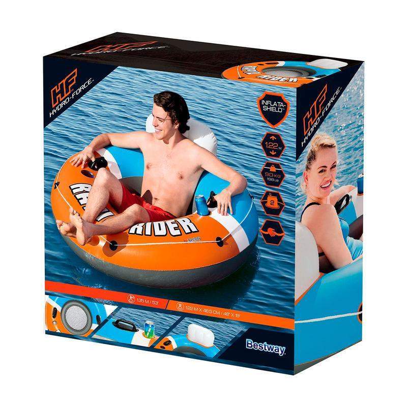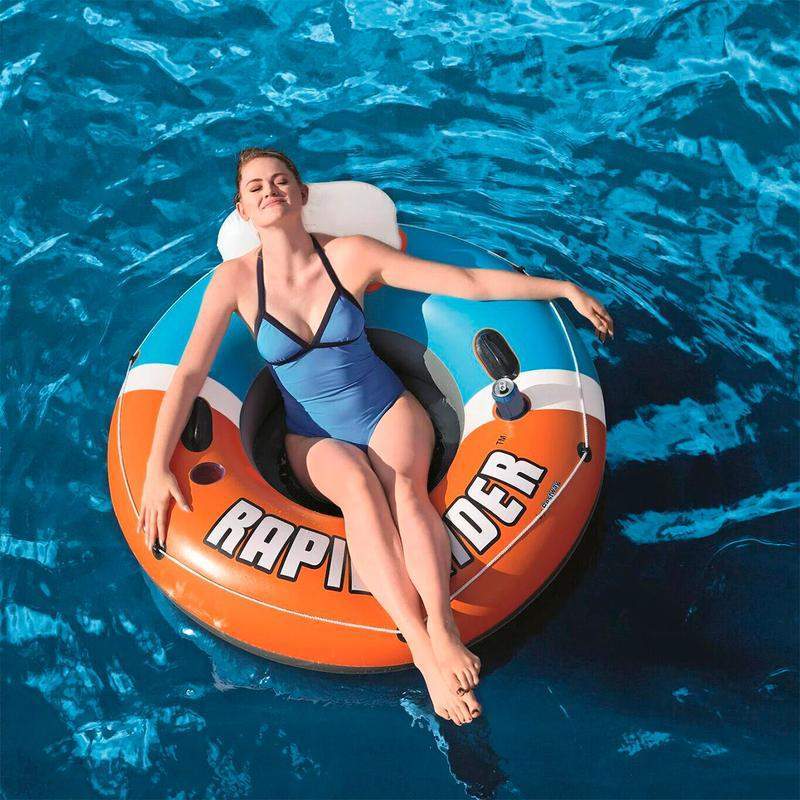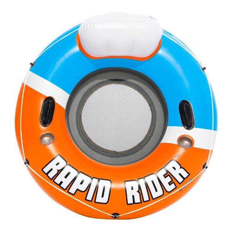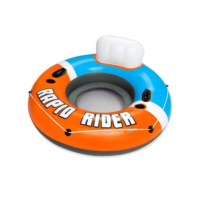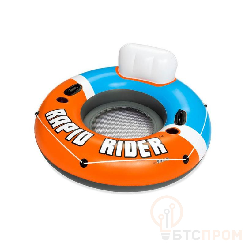 Надувной круг "Rapid Rider" выполнен из прочного материала и способен выдержать человека весом до 90 кг. У него есть ряд особенностей: веревка по периметру, 2 подстаканника, 2 удобные ручки и подголовник. На дне круга прочная сетка, чтобы точно не выйти сухим из воды. При желании в него можно посадить и ребенка, но только под присмотром взрослых. Характеристики: Размер: 135 см Шезлонг из винила, толщина 0,34/0,39 мм Максимальная нагрузка: 90 кг Тип Надувной круг Бренд Bestway Пол ребенка Унисекс Диаметр, 135 см Макс. нагрузка, 90 кг