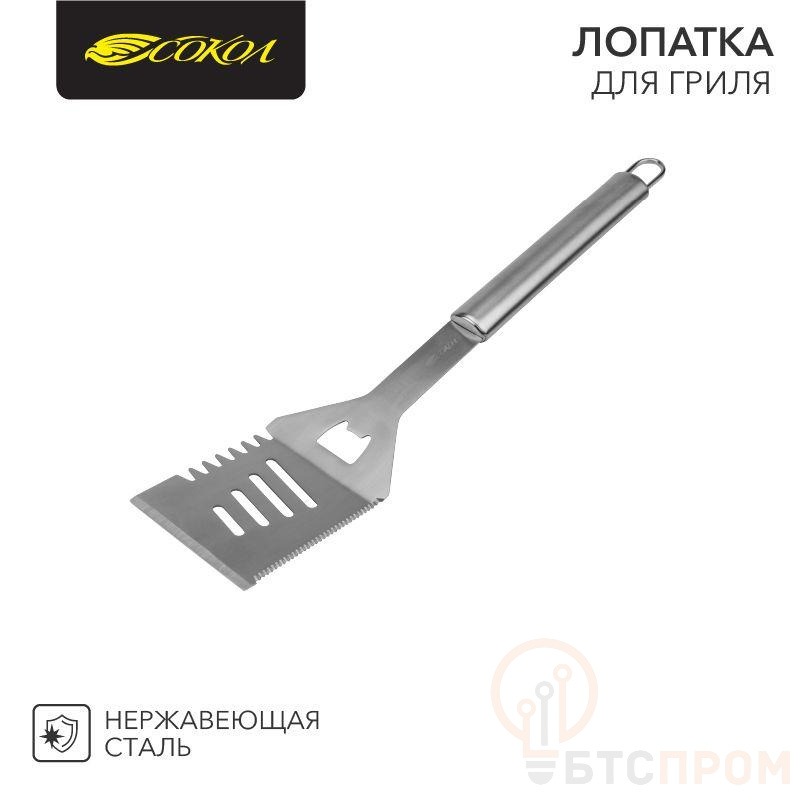 Лопатка для гриля серии Стандарт длиной 44 см имеет широкий функционал. Позволяет переворачивать еду, открывать бутылки, а с помощью зубчиков на одной из сторон - отбивать стейк. Основание шириной 9 см выполнено из прочной нержавеющей стали, не подвергающейся коррозии и существенным изменениям рабочих свойств при длительной эксплуатации. Прибор можно мыть в посудомоечной машине. Длинная рукоятка из термостойкого металла позволяет перемещать и переворачивать продукты на решетке на безопасном расстоянии от жара, предотвращая ожоги и травмы. Рабочая часть лопатки с отверстиями выполняет функцию шумовки – через отверстия происходит отток лишней жидкости (бульона, соуса или масла). Размер изделия: 440х90х1,5 мм.