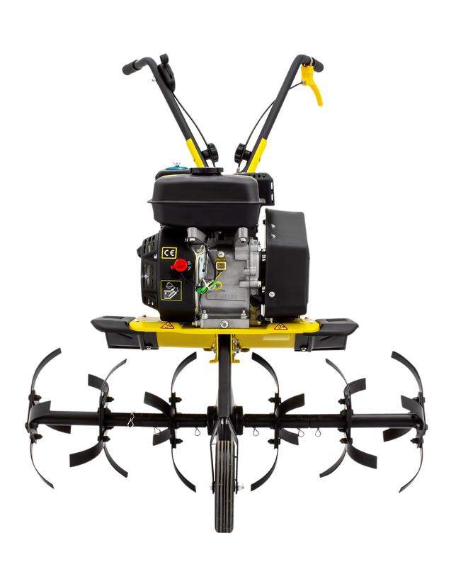 Мотокультиватор – это агрегат, предназначенный для обработки почвы методом рыхления.Мотокультиватор HUTER GMC-5.5станет оптимальным выбором для фермеров и владельцев небольших дачных участков, самостоятельно обрабатывающих землю. Конструкция культиватора HUTER GMC-5.5 представляет собой рабочую раму, на которую крепятся фрезы для обработки почвы. Диаметр фрез: 30 см. Фреза приводятся в движение бензиновым двигателем, который снабжен автоматическим регулятором частоты вращения. Мотокультиватор управляется вручную – оператор самостоятельно выбирает траекторию движения, глубину и ширину обработки почвы. Максимальная ширина обработки: 85 см. Сошником в задней части техники легко и быстро отрегулировать глубину обработки под конкретный вид почвы. Для удобства пользователя, обслуживающего технику, предусмотрено колесо в передней части для легкого перемещения и широкие крылья над фрезами для защиты от комьев земли. Безопасную работу мотокультиватора обеспечивает датчик уровня масла, который защитит двигатель от поломок при критически низком уровне масла. Мягкое нажатие сцепления гарантирует плавный пуск мотора, а усиленная поршневая система обеспечивает надежную работу машины.