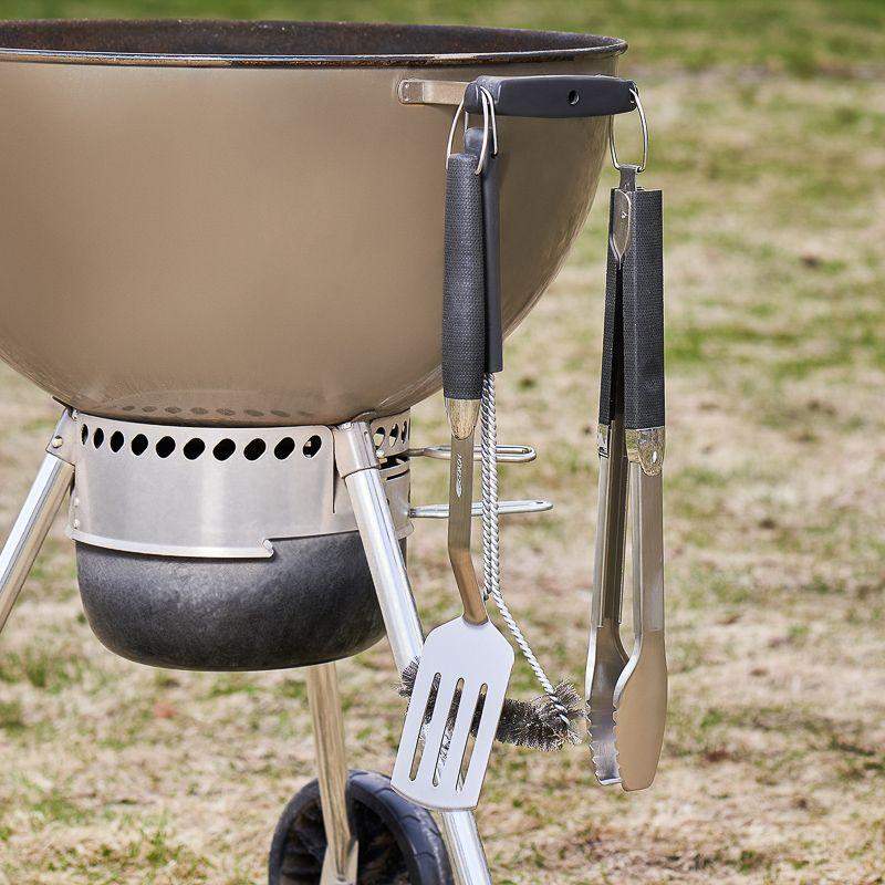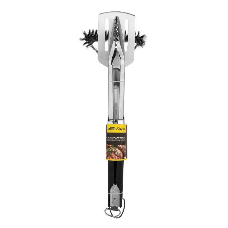 Набор для гриля серии Комфорт состоит из 3-х предметов: щипцов (440x50x1 мм), щетки (430x170) и лопатки (460x90x1,5 мм). Длинные рукоятки аксессуаров из термопластичной резины позволяют перемещать продукты на решетке на безопасном расстоянии от жара, предотвращая ожоги и травмы. Лопаткой можно переворачивать еду, не допуская повреждения структуры продукта и не делая лишних проколов. Рабочая часть лопатки с отверстиями выполняет функцию шумовки – через отверстия происходит отток лишней жидкости (бульона, соуса или масла). Благодаря специальной конструкции щипцы помогают переместить еду, не нарушив ее форму, тем самым сохраняя эстетичный вид для подачи блюда. Жесткая металлическая щетина щетки эффективно удаляет остатки пригоревшей пищи и другие сильные загрязнения. Способна вычищать мелкий сор и грязь даже из труднодоступных мест. Аксессуары выполнены из прочной и экологичной нержавеющей стали, выдерживают большие перепады температур, устойчивы к коррозии.