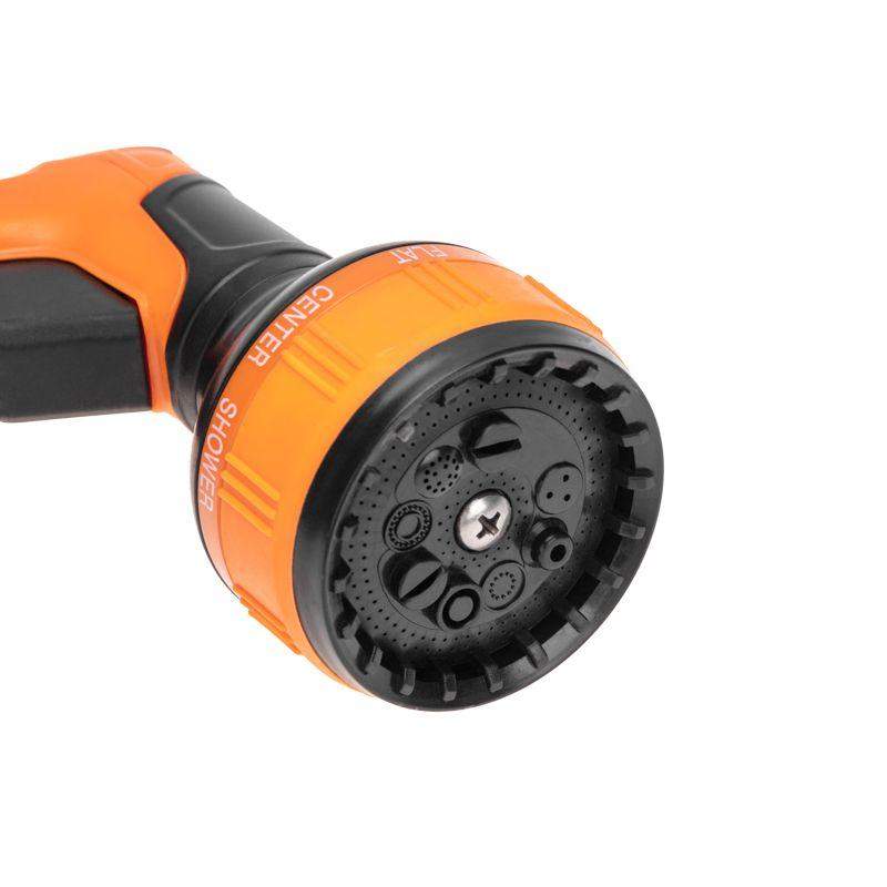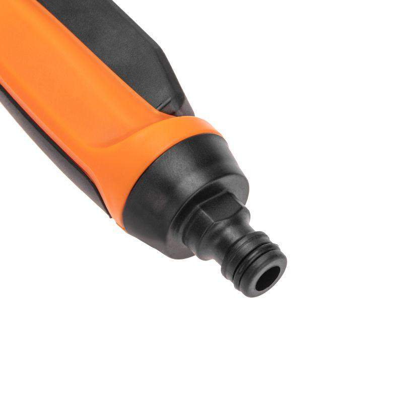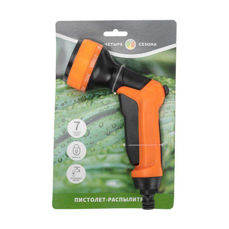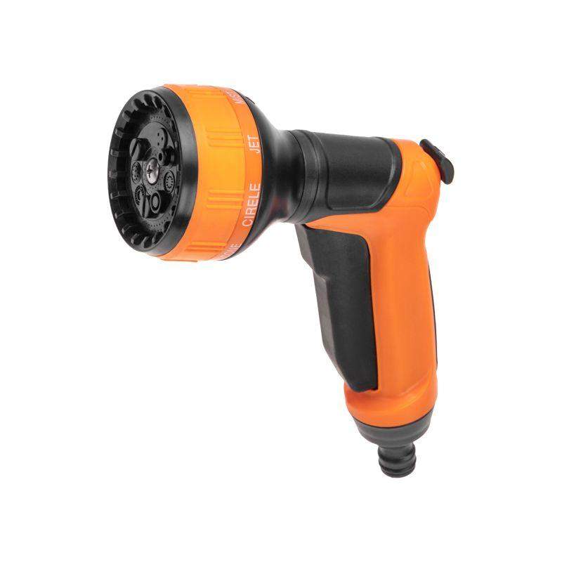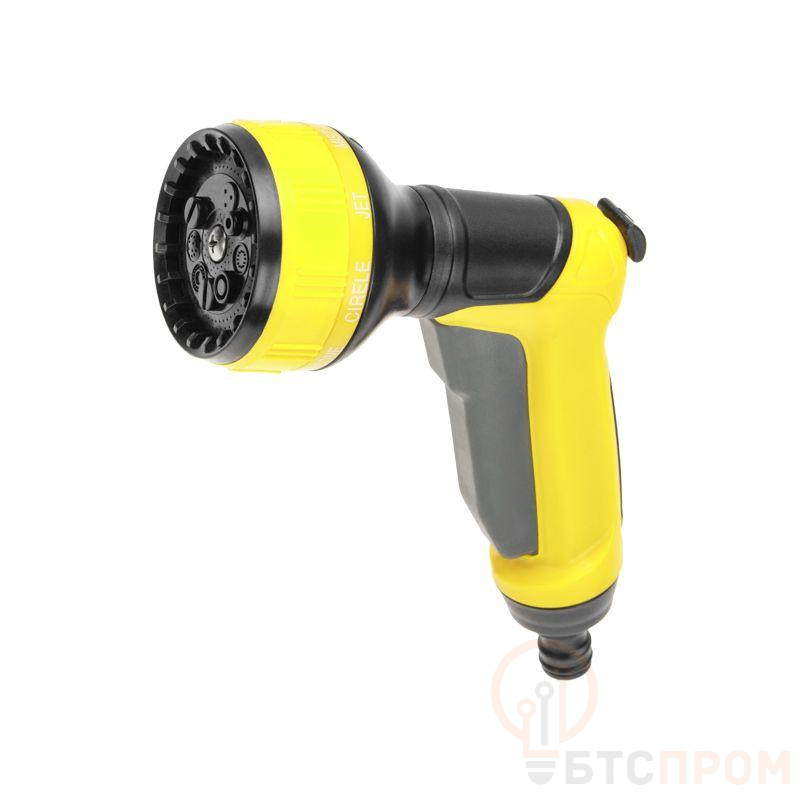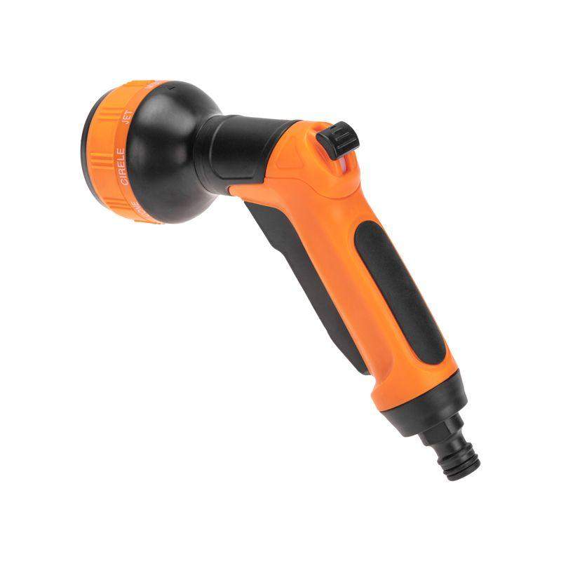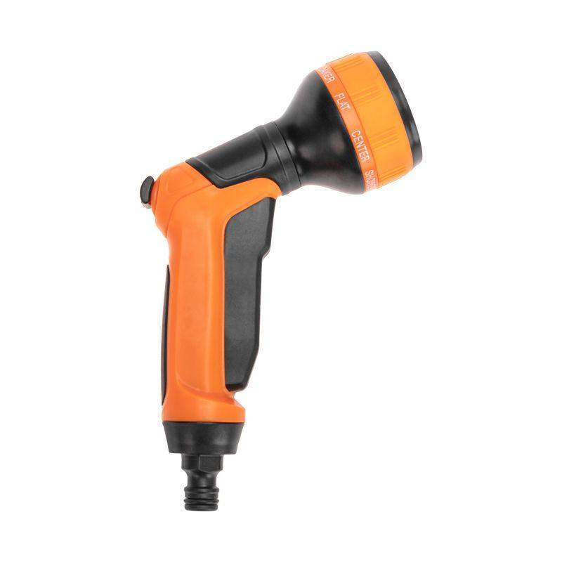 Пистолет-распылитель представляет собой садовый аксессуар, предназначенный для полива растений и почвы. Пистолет оснащен эргономичной прорезиненной ручкой, благодаря которой его удобно и комфортно держать в руке даже на протяжении длительного времени. Имеет 7 режимов подачи воды, регулируемых поворотной головкой. Легко нажимаемый курок делает процесс полива удобным и простым. Регулировка давления позволяет адаптировать интенсивность подачи воды в зависимости от конкретных потребностей. Изделие надежно и герметично крепится к шлангу при помощи универсального соединителя, расположенного на конце пистолета.