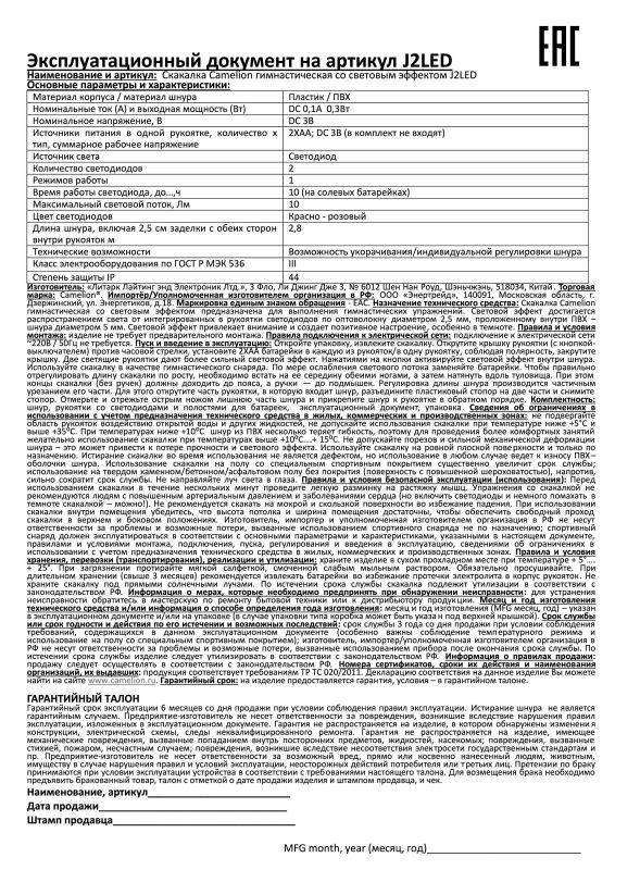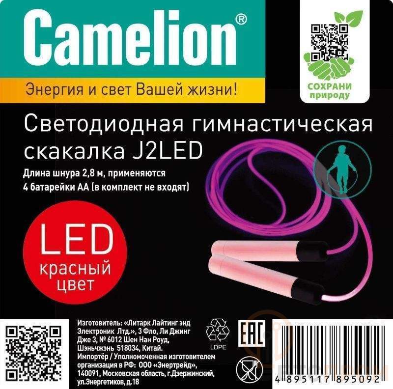 Скакалка Camelion гимнастическая со световым эффектом предназначена для выполнения гимнастических упражнений при повышенном эмоциональном фоне. Световой эффект достигается распространением света от интегрированных в рукоятки светодиодов по оптоволокну диаметром 2,5 мм, проложенному внутри ПВХ – шнура диаметром 5 мм. Свет привлекает внимание и создает позитивное настроение. Электропитание светодиодов – от двух батареек типа АА, устанавливаемых в рукоятки. Световой эффект достигается как при включении обеих рукояток, так и при включении любой одной из них