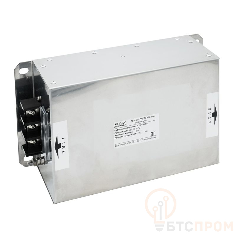 Фильтр ЭМС DKC V2000-920-100 — это трехфазный сетевой фильтр, предназначенный для эффективного подавления электромагнитных помех, создаваемых частотными преобразователями серии V2000. Он обеспечивает соответствие оборудования строгим нормам электромагнитной совместимости (ЭМС).