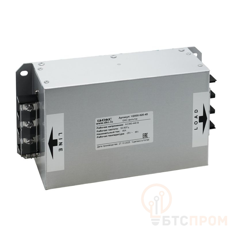 Фильтр ЭМС DKC V2000-920-45 — трехфазный сетевой фильтр, предназначенный для эффективного подавления электромагнитных помех, создаваемых частотными преобразователями. Он обеспечивает соответствие оборудования строгим нормам электромагнитной совместимости (ЭМС), защищая как сам привод, так и чувствительную периферийную аппаратуру от высокочастотных искажений и гармоник.