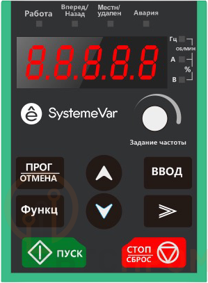 LED панель управления для преобразователей частоты серии SystemeVar, типа STV320 (входит в комплект поставки STV320***N4 (3Ф 400В) номинальной мощностью от 4 кВт (включительно). Панель позволяет контролировать запуск / останов ПЧ, параметрировать преобразователь и выводить данные состояния. Поддерживает копирование параметров. Чтобы закрепить панель оператора на дверце шкафа можно использовать винты M3x10 (2 шт.) или дополнительный кронштейн (референс для заказа: SEOP-1103), а также стандартный экранированный LAN-кабель (Ethernet патч-корд, c разъёмом RJ-45), рекомендованная длина ? 3м. Встроенная функция копирования параметров (панель оператора поддерживает 1 набор параметров ПЧ). Габаритные размеры (ДхШхВ): 56 х 17(30,6) х 7 мм.