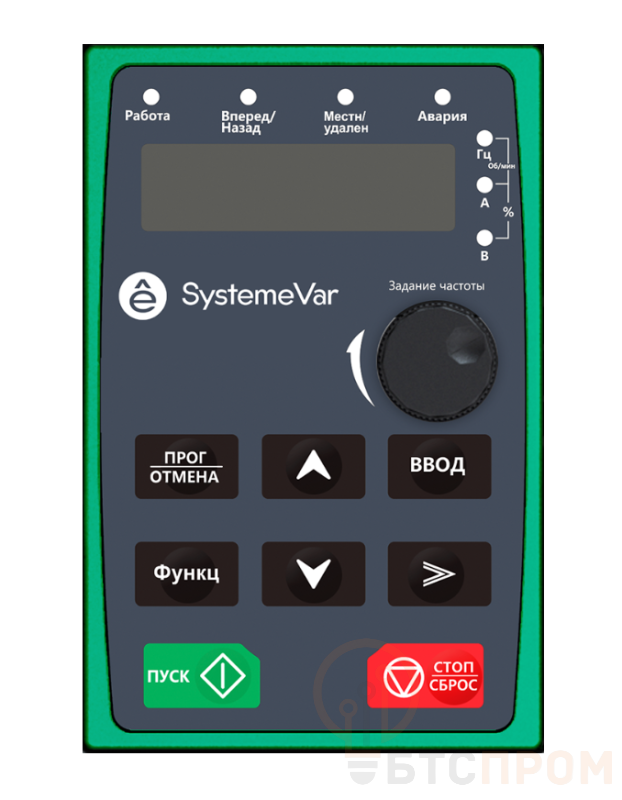 LED панель управления преобразователей частоты серии SystemeVar, типа STV600 (входит в комплект поставки STV600***N4 (3Ф 400В). Панель позволяет контролировать запуск / останов ПЧ, параметрировать преобразователь и выводить данные состояния. Поддерживает копирование параметров. Чтобы закрепить панель оператора на дверце шкафа можно использовать винты M3х10 (2 шт., входят в комплект поставки) или дополнительный кронштейн (референс для заказа: SEOP-1102), а также стандартный экранированный LAN-кабель (Ethernet патч-корд, c разъёмом RJ-45), рекомендованная длина ? 3м. Встроенная функция копирования параметров (панель оператора поддерживает 1 набор параметров ПЧ). Габаритные размеры (ДхШхВ): 109,3 х 71,3 х 18(37,1) мм.