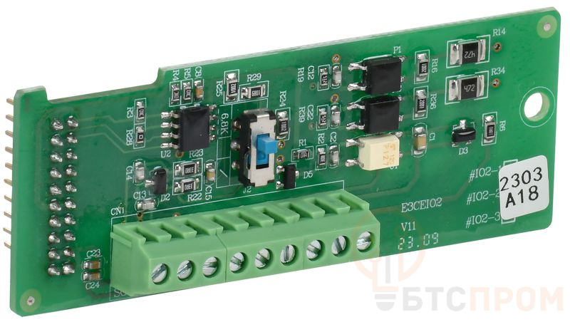 Плата расширения представляет собой электронную микросхему, позволяющую добавить 2 цифровых входа, 1 релейный выход с НО НЗ контактом, RS485 Modbus интерфейс к ПЧ А150