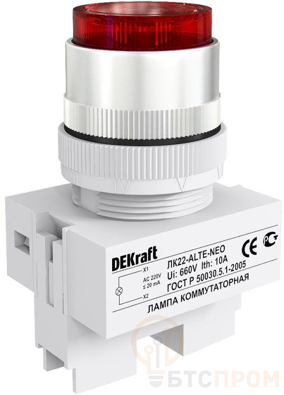 Лампа сигнальная ADDS серии ЛК-22 Dekraft; светодиодная; красная неоновая; круглая; номинальное напряжение 220 В пер.тока; установка - на панели или двери; степень защиты - IP54. Лампы сигнальные предназначены для индикации состояния электрических цепей и коммутационных аппаратов. Использование в лампах светодиодных матриц (LED) снижает потребление электроэнергии. Низкая чувствительность к колебаниям напряжения позволяет использовать их в электрических цепях с нестабильным напряжением.