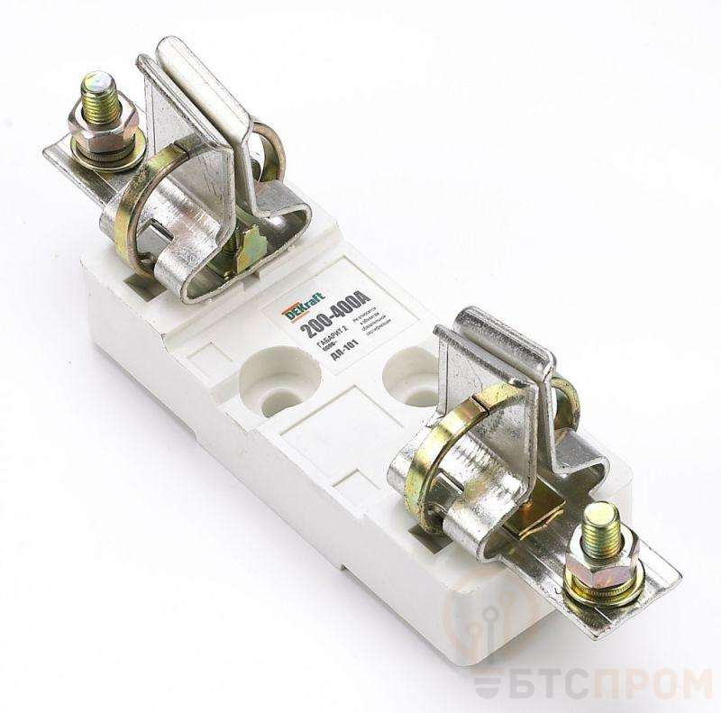 Держатель ножевого предохранителя серии ПН-101 Dekraft; тип 37; габарит 00; номинальный ток до 400 А. Предохранители ножевые применяются в однофазных и трехфазных сетях переменного тока, напряжением до 660 В, частотой 50 Гц. Держатель устойчив к механическим и термическим воздействиям, а также динамическим ударам при коротких замыканиях.