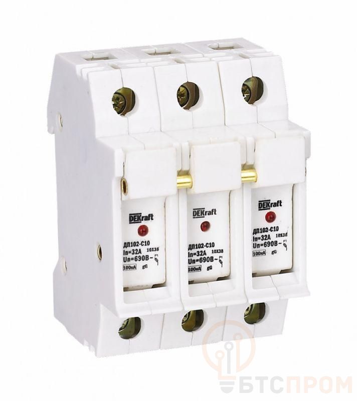 Держатель серии ДП-102 цилиндрического предохранителя ПЦ-102 Dekraft; 3P; для габарита С10 (10 x 38 мм); со светодиодной индикацией срабатывания; номинальный ток – до 32 А; ширина – 3 мод. х 18 мм; установка – на DIN- рейку; рабочее положение - любое, но предпочтительнее вертикальное; подключение питания - сверху или снизу; степень защиты – IP20. Предохранители применяются для защиты сетей от перегрузки и токов КЗ в сетях напряжением до 500 В.