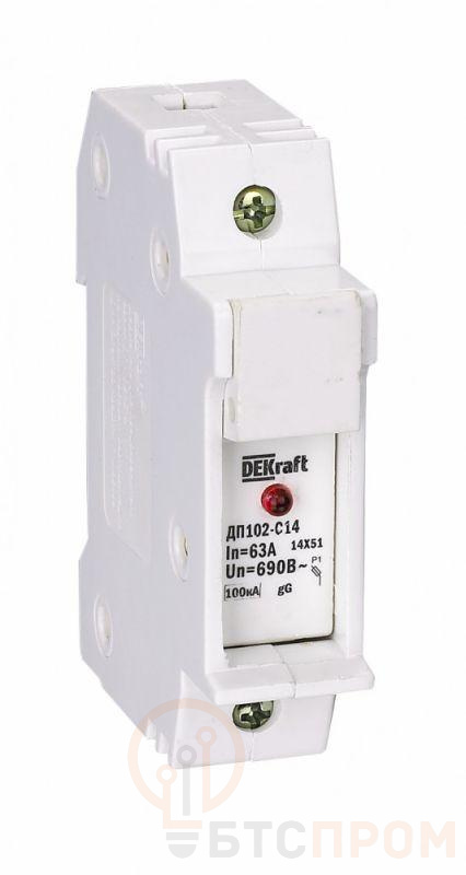 Держатель серии ДП-102 цилиндрического предохранителя ПЦ-102 Dekraft; 1P; для габарита С14 (14 x 51 мм); со светодиодной индикацией срабатывания; номинальный ток – до 64 А; ширина – 1 модуль х 18 мм; установка – на DIN- рейку; рабочее положение - любое, но предпочтительнее вертикальное; подключение питания - сверху или снизу; степень защиты – IP20. Предохранители применяются для защиты сетей от перегрузки и токов КЗ в сетях напряжением до 500 В.