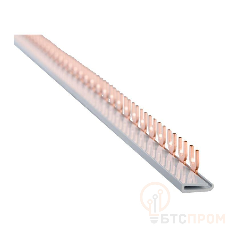 Шины соединительные представляют собой пластины, выполненные из меди, закрепленные в корпусе из диэлектрического материала, не поддерживающего горения и выпускаются стандартной длиной 1 метр. В наличии полный перечень шин для подключения 1, 2, 3, 4 полюсных устройств на токи до 100 А. Номинальный ток In (А): 63