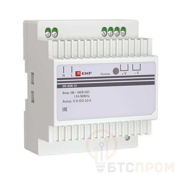 Блоки питания серии DR напряжениями 5/12/24/48 В, EKF устанавливаются на DIN рейку и предназначены для преобразования входного переменного напряжения 100-240 В в постоянное стабилизированное напряжение 5,12,24 или 48 Вольт.