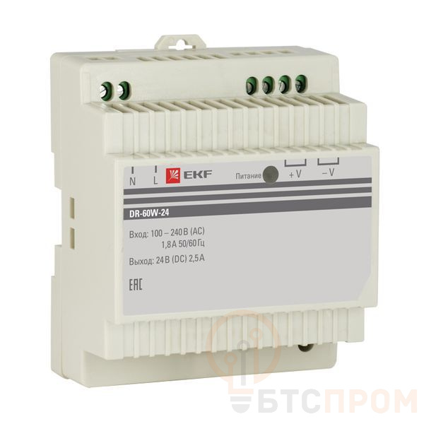 Блоки питания серии DR напряжениями 5/12/24/48 В, EKF устанавливаются на DIN рейку и предназначены для преобразования входного переменного напряжения 100-240 В в постоянное стабилизированное напряжение 5,12,24 или 48 Вольт.