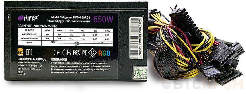 Блок питания HPB-650RGB PSU HPB-650RGB (ATX 2.31 650Вт ActivePFC RGB 140мм fan Black) 85+ BOX HIPER 1000535173