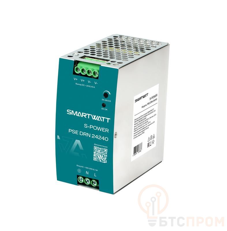 Импульсный блок питания SMARTWATT PSE DRN 24240 линейки S-POWER обеспечивает качественное электроснабжение потребителей, преобразуя напряжение сети переменного тока в стабилизированное напряжение постоянного тока. Серия DRN гарантирует качественное питание контроллеров, датчиков, электронных компонентов и различных электроприводов для критически важного оборудования в различных промышленных системах автоматического управления вентиляцией, отоплением, электроснабжением и электрораспределением, водоотведением, роботизированными станками и машинами, где важна степень помехоустойчивости и низкое излучение электромагнитных помех.