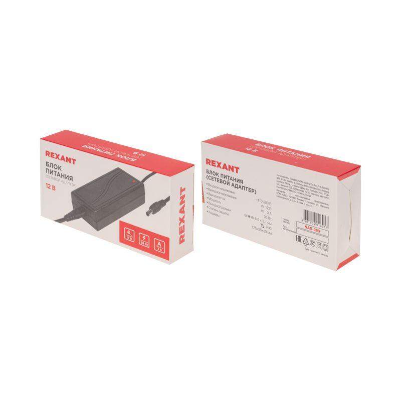Источник питания 110-220В AC/12В DC 3А 36Вт с DC разъемом подключения 5.5х2.1 без влагозащ. IP23 Rexant 200-036-3