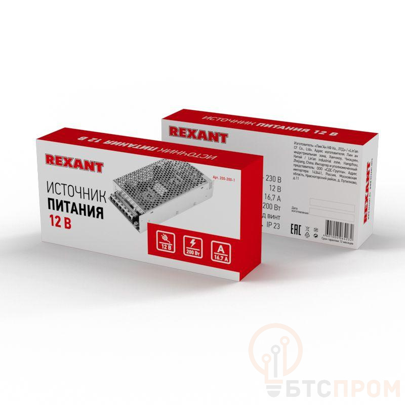 Источник питания 220В AC/12В DC 16.7A 200Вт с разъемами под винт без влагозащ. IP23 Rexant 200-200-1